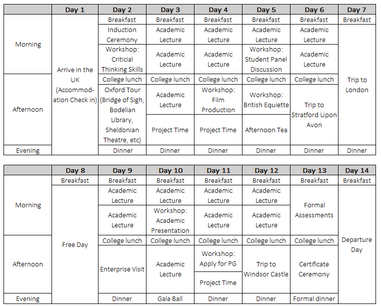 本项目主要包括跨学科学术课程、实践工作坊、行业特邀嘉宾讲座、英国企业参访、英式社交拓展及英伦文化体验六部分组成。具体如下: