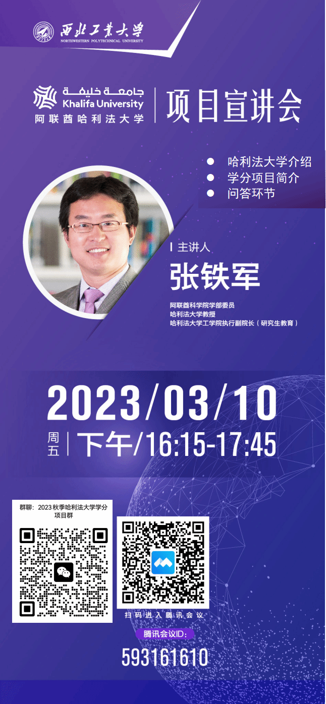 哈利法大学项目针对本校大三、大四在读本科生,研一、研二硕士研究生进行选拔,学生将于2023年秋季学期赴阿联酋哈利法大学完成一学期的课程学习,项目完成且表现优异者可有机会获得哈利法大学硕士/博士研究生预录取资格(由CSC资助)。