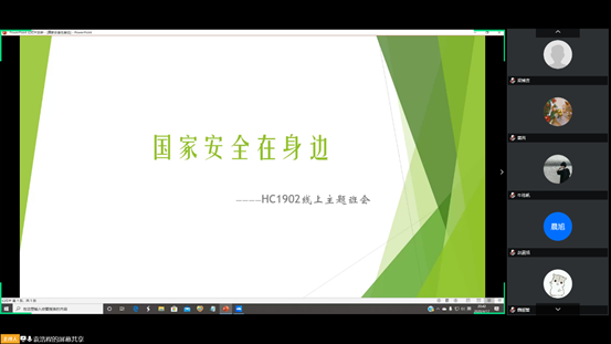 4月17日晚上20:40,HC001902班线上召开国家安全教育主题班会,班主任叶昉老师、辅导员黄芮老师参加会议,班会由班长袁浩程主持。