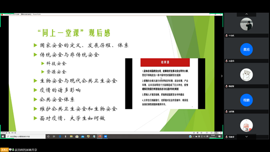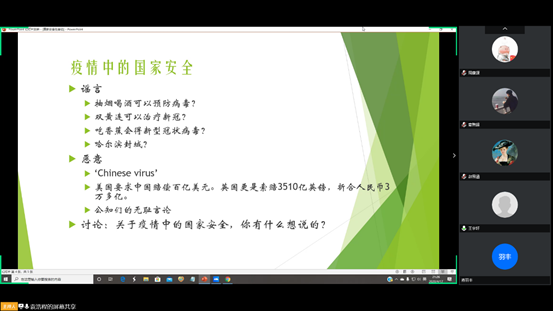 最后,袁浩程总结了疫情暴露出的国家安全面临的挑战,包括谣言的传播,和境外敌对势力对中国的恶意,引导同学们就这个话题展开讨论。柴榕同学用精彩的发言告诫同学们反思自己,不要因为自己的冲动让自己成为了境外势力的棋子,任何时候都应该信任国家信任人民。王宇轩同学希望大家能够学会辨别信息,不信谣不传谣,呼吁大家消除偏见和歧视。同学们纷纷表达了对提高防范意识,自觉维护国家安全的决心。最后,黄芮老师发表总结讲话。
