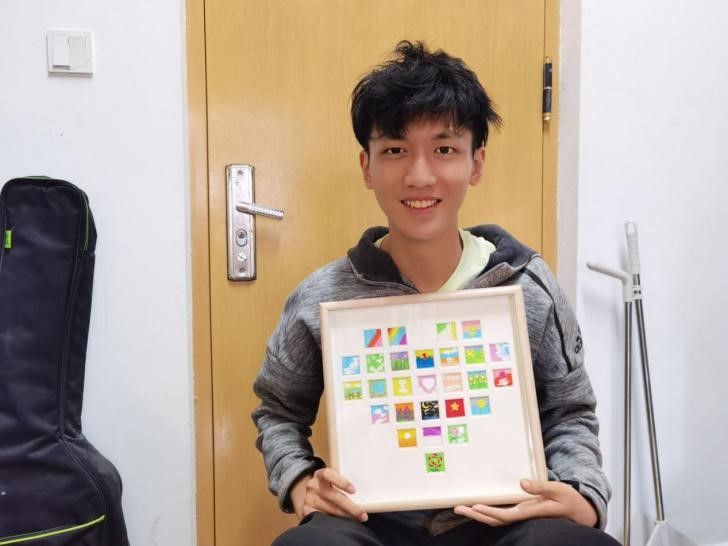 “微笑就是阳光,它能消除人们脸上的冬色。怀抱着舍友精心创作的画作,微笑着去面对每一天的生活。”