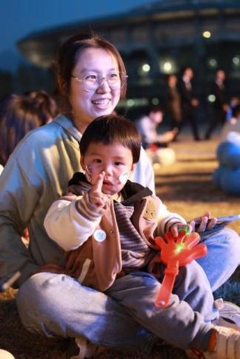 照片摄于云天苑操场研究生毕业歌会期间,老师带着孩子也来观看。在歌声与灯光中,伴着夜色,观众逸兴遄飞。