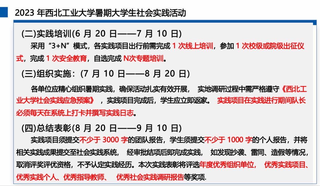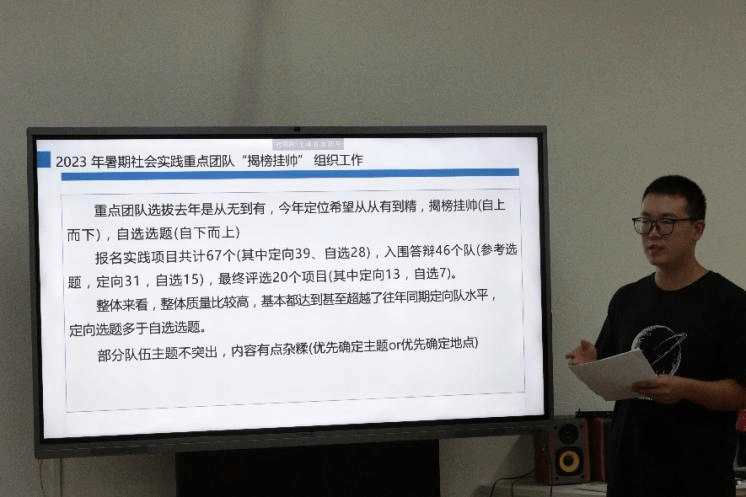 最后,他重点介绍了暑期社会实践活动的基本要求、资助细则、评审办法等。鼓励同学们重视实践成果的转化,积极通过制作vlog、微电影、画册等多媒体作品,撰写优质实践报告等,将自己在社会实践中的心得和收获表现出来,影响和教育更多的人。