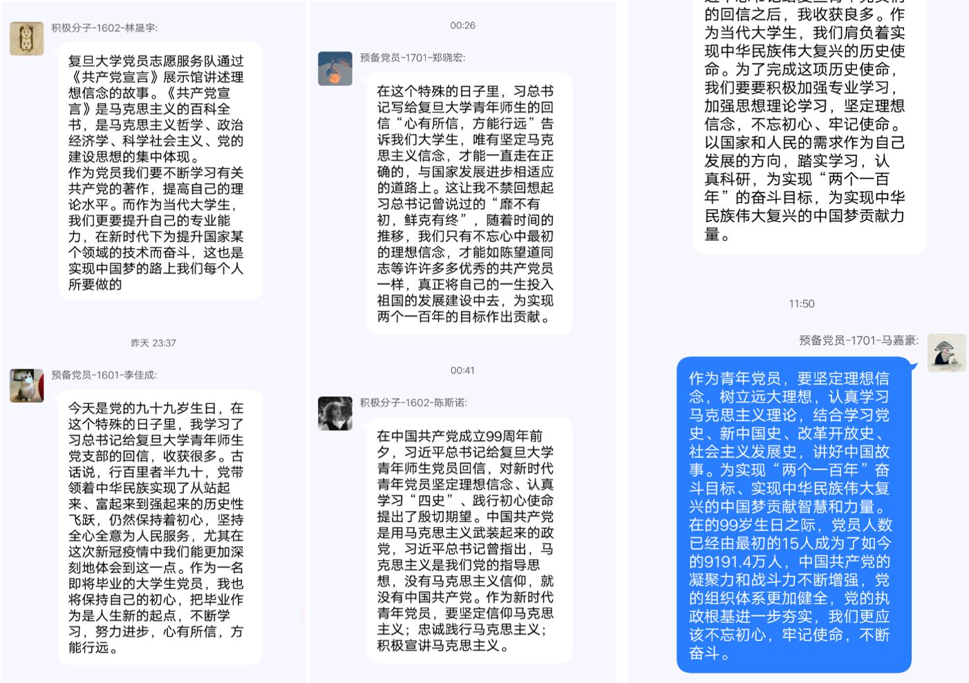 99年的峥嵘岁月,99年的历史沧桑,99年如磐石般,屹立在世界的东方。2020年是中国共产党建党99周年,是全面打赢脱贫攻坚战的收官之年,更是全民抗击疫情的不平凡之年。根据学校党委学生工作部关于组织开展“迎党的生日、悟初心使命”主题党日活动的通知要求,bat365在线官网平台5个学生党支部于7月1日至7月4日结合实际情况分别在线开展了“学习回信,为党庆生”主题党日活动,同学们认真研读了习近平同志给复旦大学青年师生党支部的回信后,纷纷在线分享自己的学习体会。