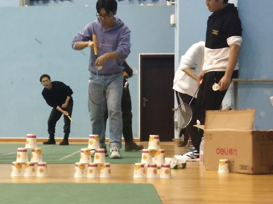 本次联谊活动主要分为竞技比赛和趣味运动两个环节。竞技比赛由参与者抽签决定分组,并采用淘汰赛制。经过12位同学在三轮淘汰赛中的激烈比拼,材料学院王涵铭、金鸿儒、余耀辰成功入围前三强。在决赛中各位同学均展示出看家本领,实力不相上下,各种精彩扣杀层出不穷,其中王涵铭同学表现优异,在决赛对决时刻,通过精湛的羽毛球技术两次反超比分,成功获得冠军。此外,本次活动也为不擅长竞技比赛的同学准备了丰富多样的羽毛球主题趣味运动,例如羽毛球投壶、纸杯大作战等。趣味运动极大地锻炼了同学们的羽毛球技术,激发了大家对于羽毛球运动的兴趣,同学们乐在其中,场边洋溢着欢声笑语。
