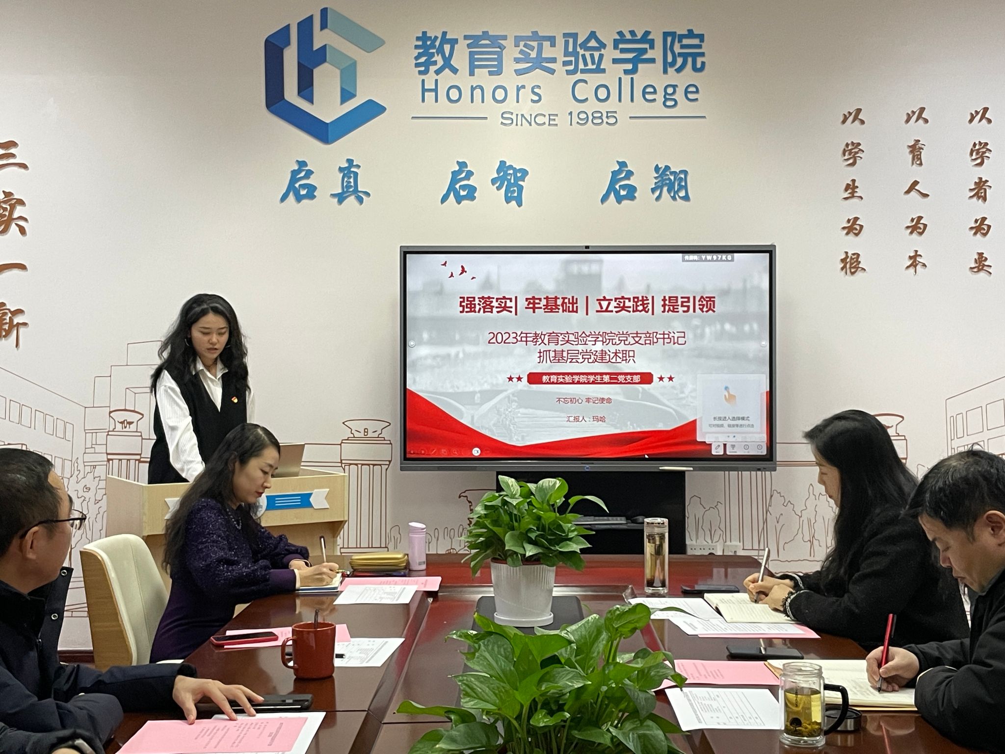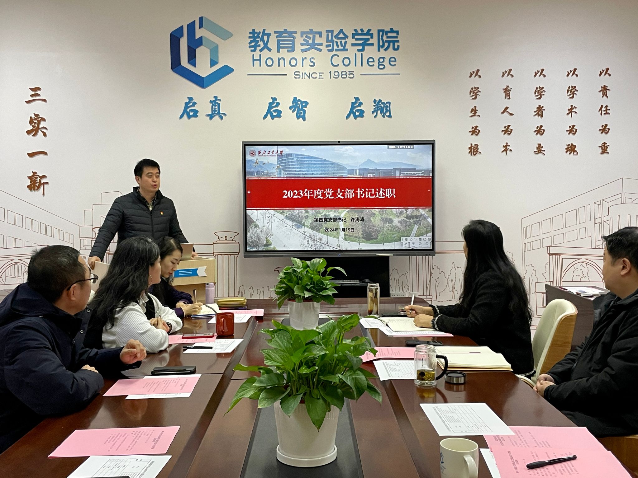 首先,牟蕾简要介绍了2023年度党支部书记抓党建述职评议考核的主要内容及评议方法。随后4名党支部书记分别围绕深入学习贯彻习近平新时代中国特色社会主义思想和党的二十大精神、落实基层党建工作重点任务、强化党支部政治功能和组织功能、做好师生思想政治教育、落实全面从严治党要求、加强师生思想政治教育及落实意识形态工作责任制五个方面进行述职,并对党支部建设存在的问题及2024年重点工作计划逐一进行了汇报。林鑫在点评时肯定了各支部取得的成绩,并指出各支部要结合bat365在线官网平台/未来技术学院发展特点及学生特点,围绕学院“127”发展目标,创新思路、深入谋划,加强统筹,着力体现学院发展与人才培养的鲜明特色。