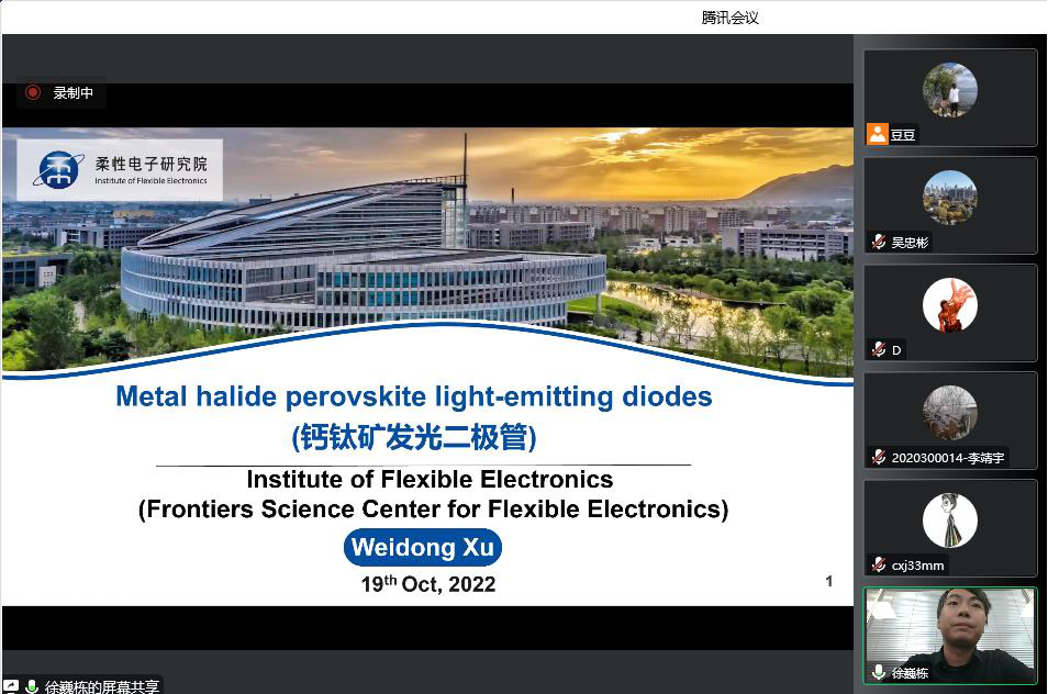 柔性电子是将有机、无机或者有机无机杂化材料沉积到柔性基底形成以电路为代表的电子(光电子)元器件及其集成系统的一门新兴交叉学科。吴忠彬教授围绕柔性有机电子以及柔性有机信息显示的发展现状以及未来的发展趋势,详细介绍构筑柔性信息显示器件的核心单元,薄膜晶体管和发光二极管相关的基础知识。徐巍栋教授介绍了课题组在钙钛矿发光二极管领域的发现与突破,包括“钙钛矿维度调控实现高效发光”“亚微米结构实现高效光提取”以及“高性能钙钛矿发光二极管的理性分子钝化”等。