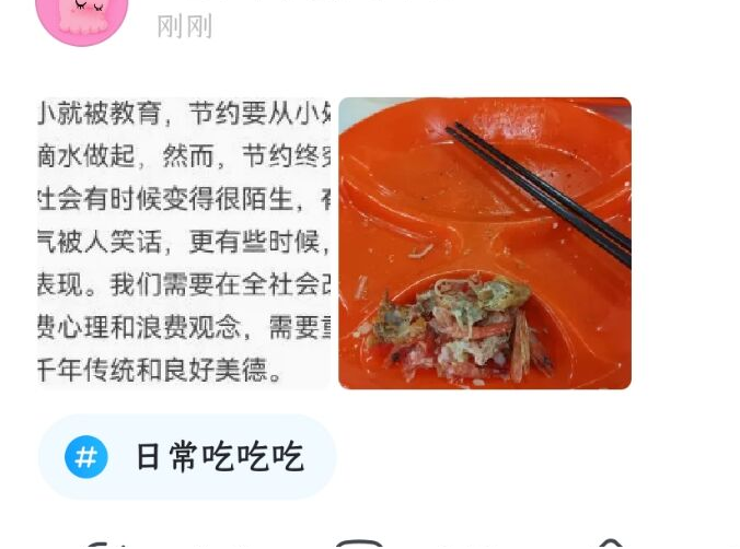 “一粥一饭,当思来之不易;半丝半缕,恒念物力维艰。”小小餐桌,展现了中华民族尊重劳动、珍惜粮食的优秀文化。勤俭节约,不仅仅是个人良好素质的体现,更是对我国传统美德的继承和弘扬。无论今天的物质生活有多么丰富,“光盘”都是一份不可推卸的职责。