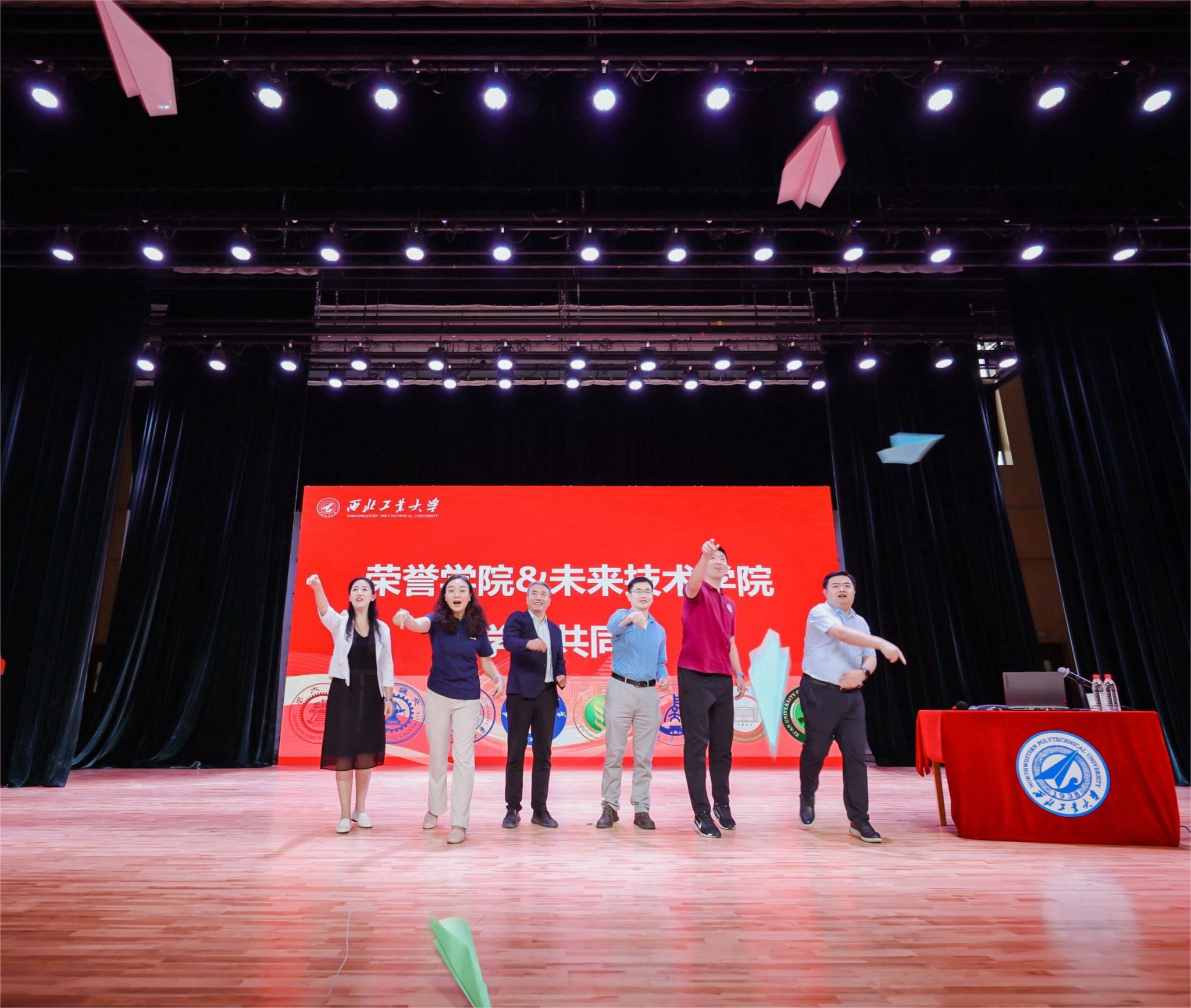 林鑫、牟蕾与兄弟高校荣誉学院、未来技术学院的领导们共同放飞纸飞机,宣布本届学生节开幕,共筑学习共同体、助力拔尖人才成长。