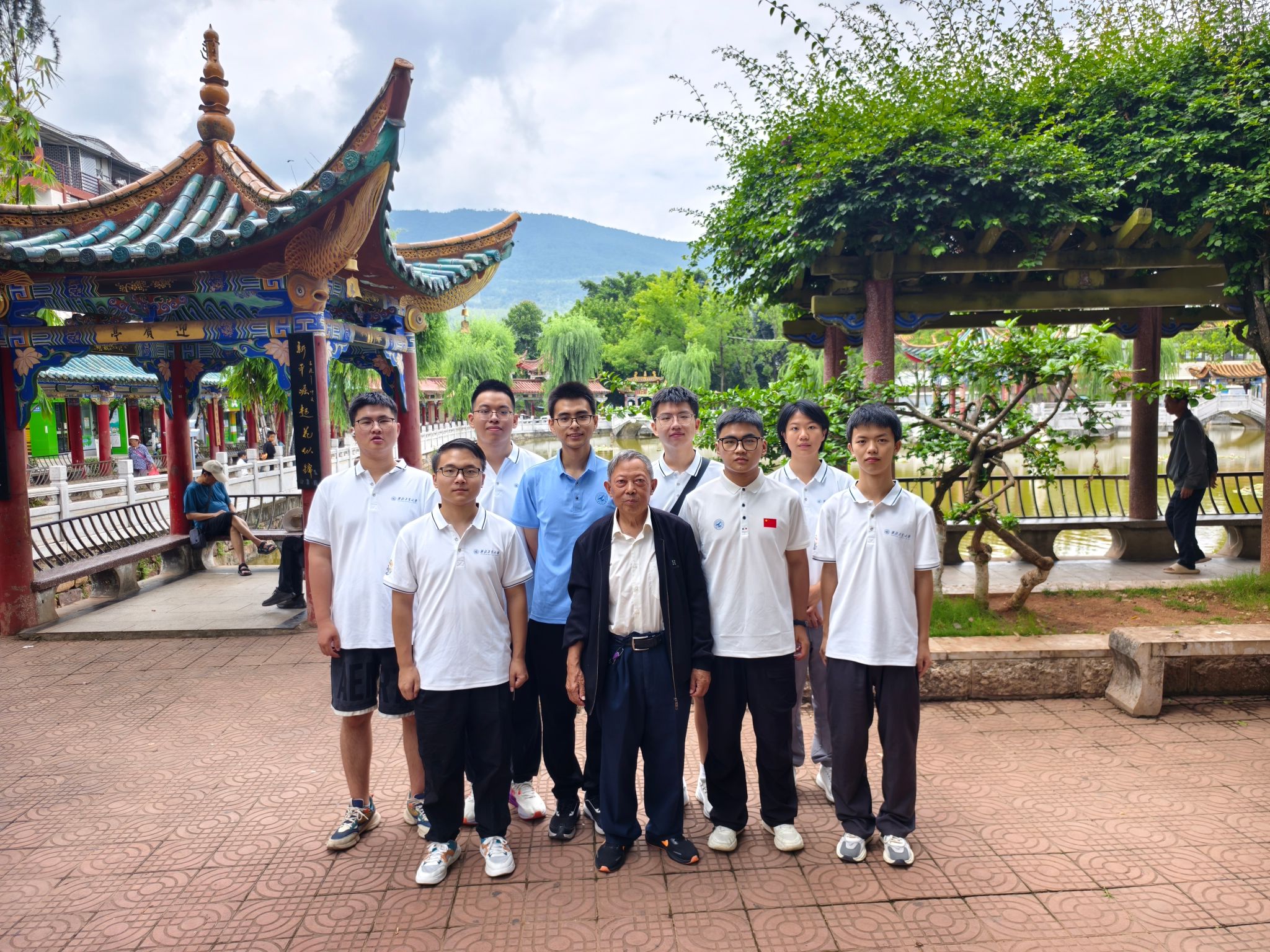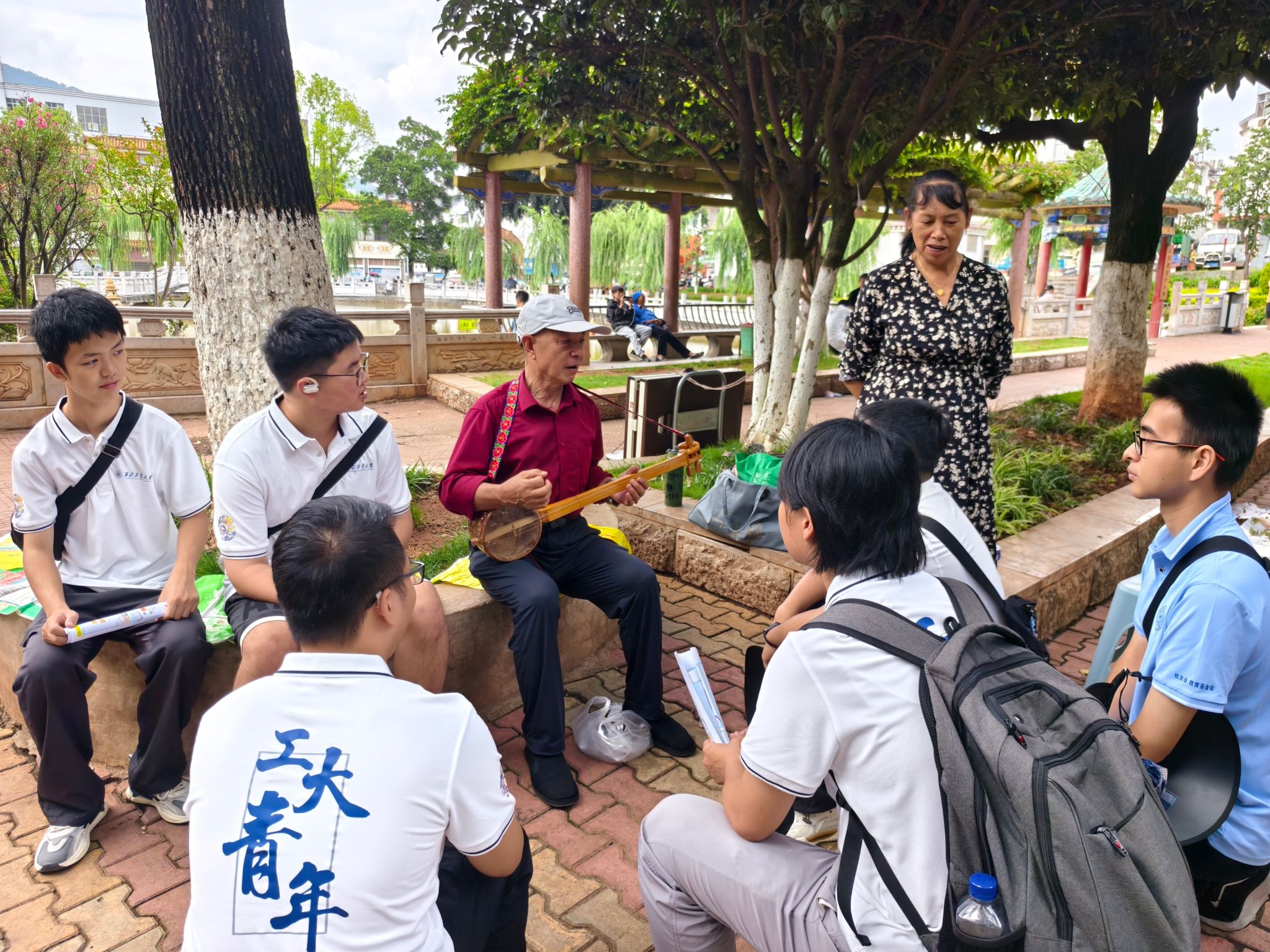 交流中,一位健谈的老人主动讲述新平县的起源传说与地方逸闻,言语间满是对新时代建设成就的自豪。花园中央老树下,另一位老人用流利普通话分享孩子的求学经历,让队员们了解到当地在普及普通话、平衡教育公平与民族特色方面的实践。两位老人向实践队描摹了一幅民族团结的画卷——在党的领导下,少数民族地区基础建设跃升,产业兴旺,民生改善,各族同心,共谱繁荣发展新篇。