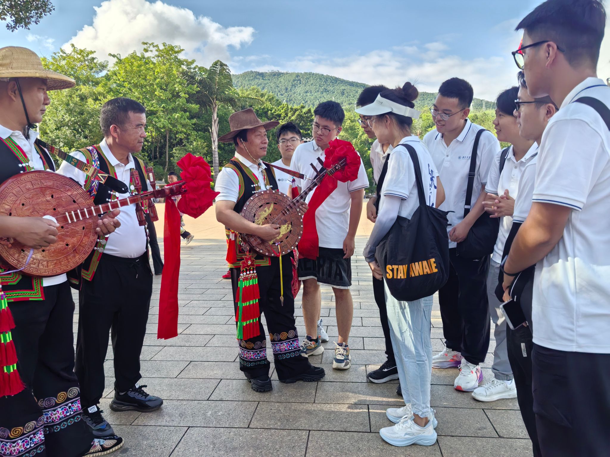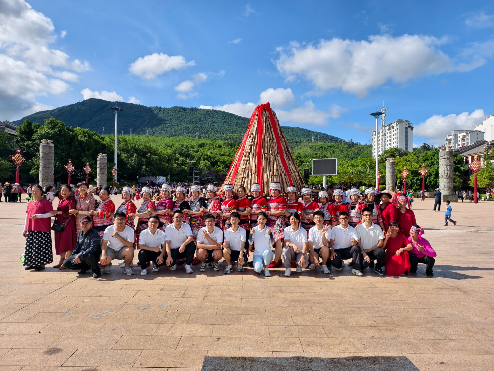 为深入了解少数民族文化、感受民族团结的氛围,当日上午,实践队抵达民族广场,以志愿者身份参与火把节筹备,负责维护秩序、布置会场,保证彩排的顺利进行。会场筹备期间,实践队员偶遇一群专程从漠沙镇赶来的彝族老人。老人们热情地邀请队员们加入他们的歌舞,围成圆圈跳起民族舞蹈,唱起迎客山歌。他们解释道,这些歌舞是献给远道而来客人的特殊礼遇,既表达对新平访客的欢迎,也感谢大家对火把节的支持。通过这生动互动,队员们深切体会到少数民族文化的独特魅力和当地人民的淳朴热情。