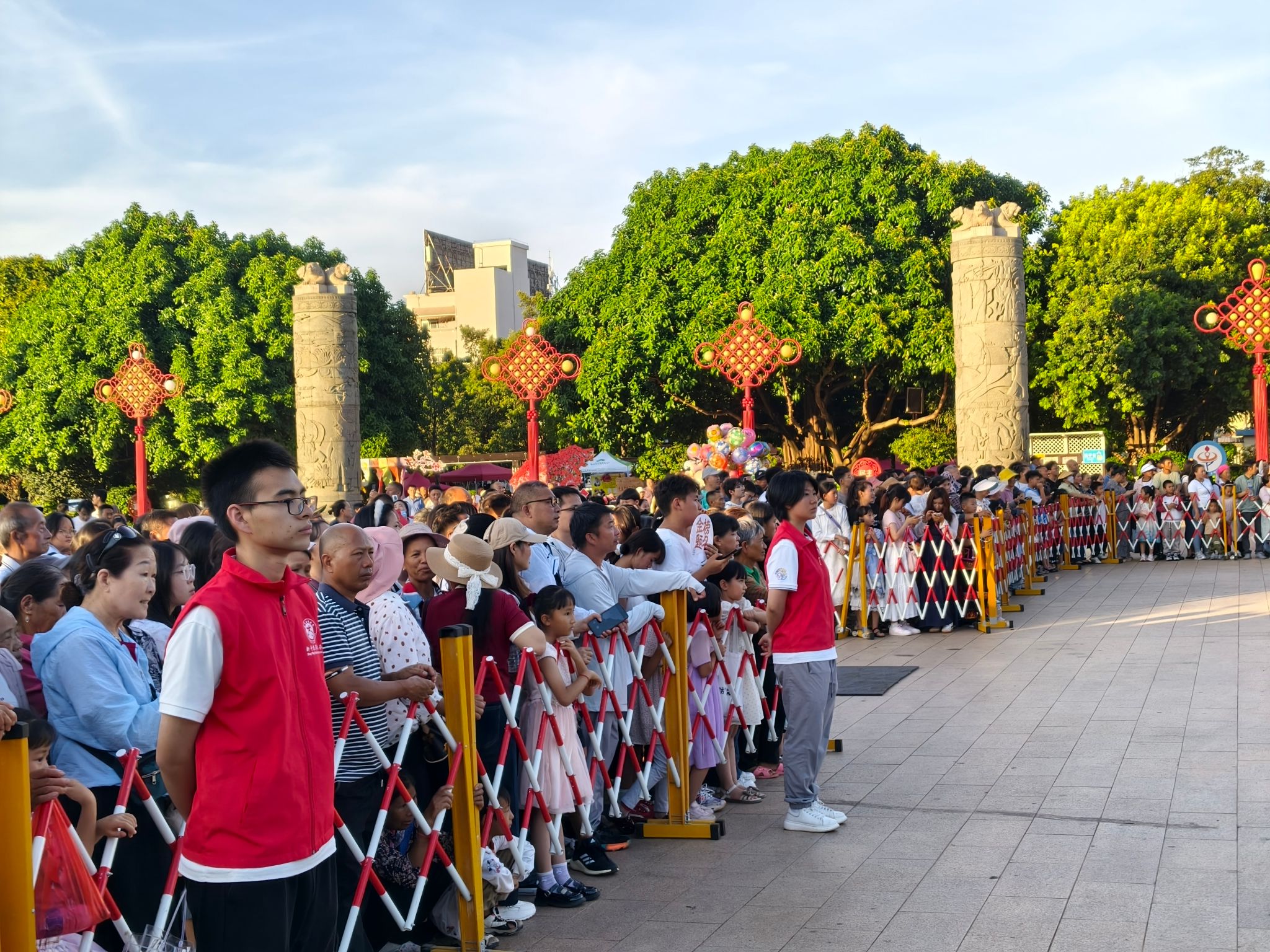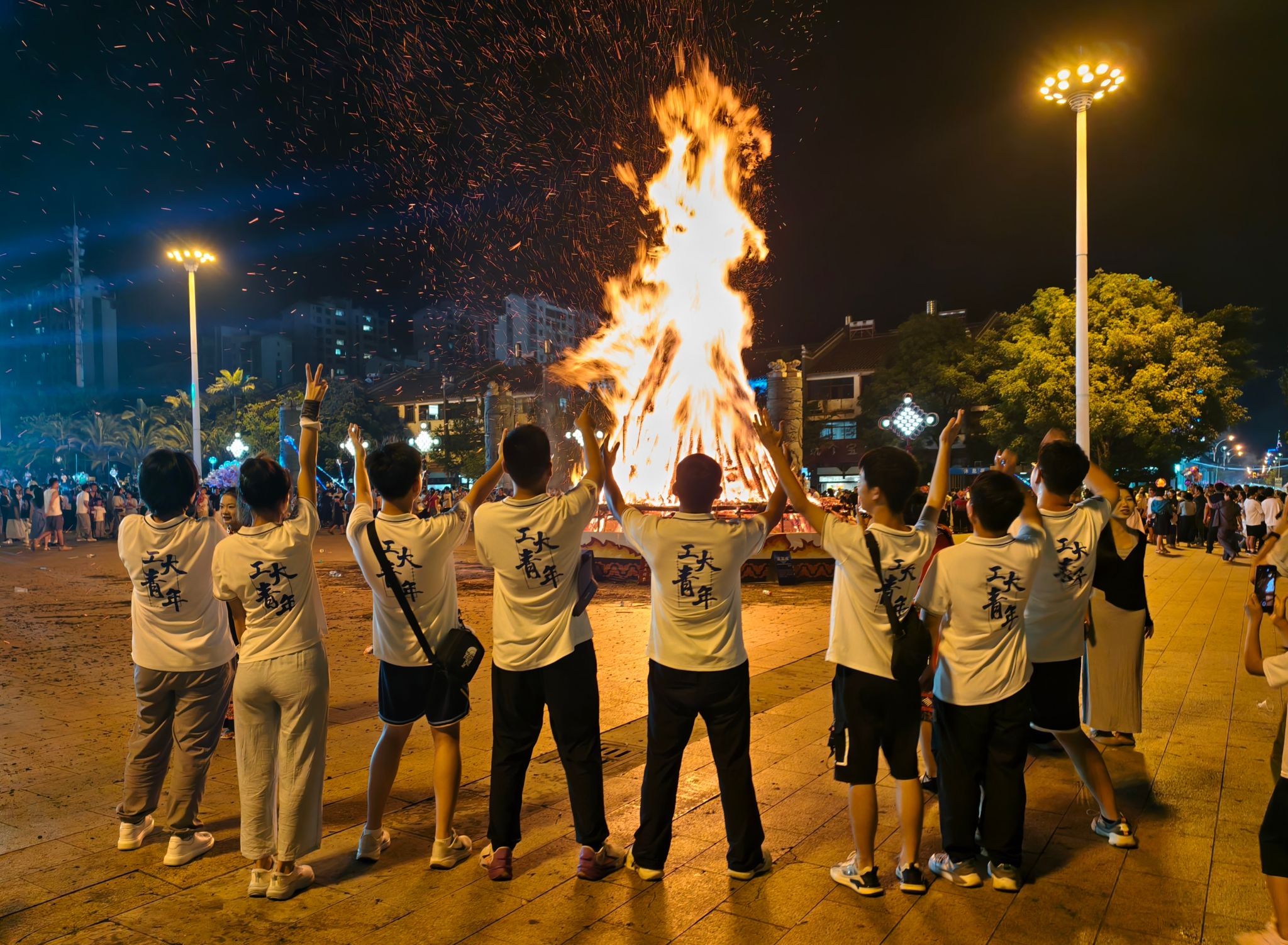 晚19:30,经过白天的精心筹备,民族广场迎来盛大的火把节点火仪式。随着观众陆续入场,广场中央的巨大篝火旁逐渐围满人群。为确保活动安全有序,实践队在当地民警的安排下,承担起现场秩序维护与后期收尾工作,在表演区域各出入口值守,引导观众文明观礼,为仪式顺利举行保驾护航。