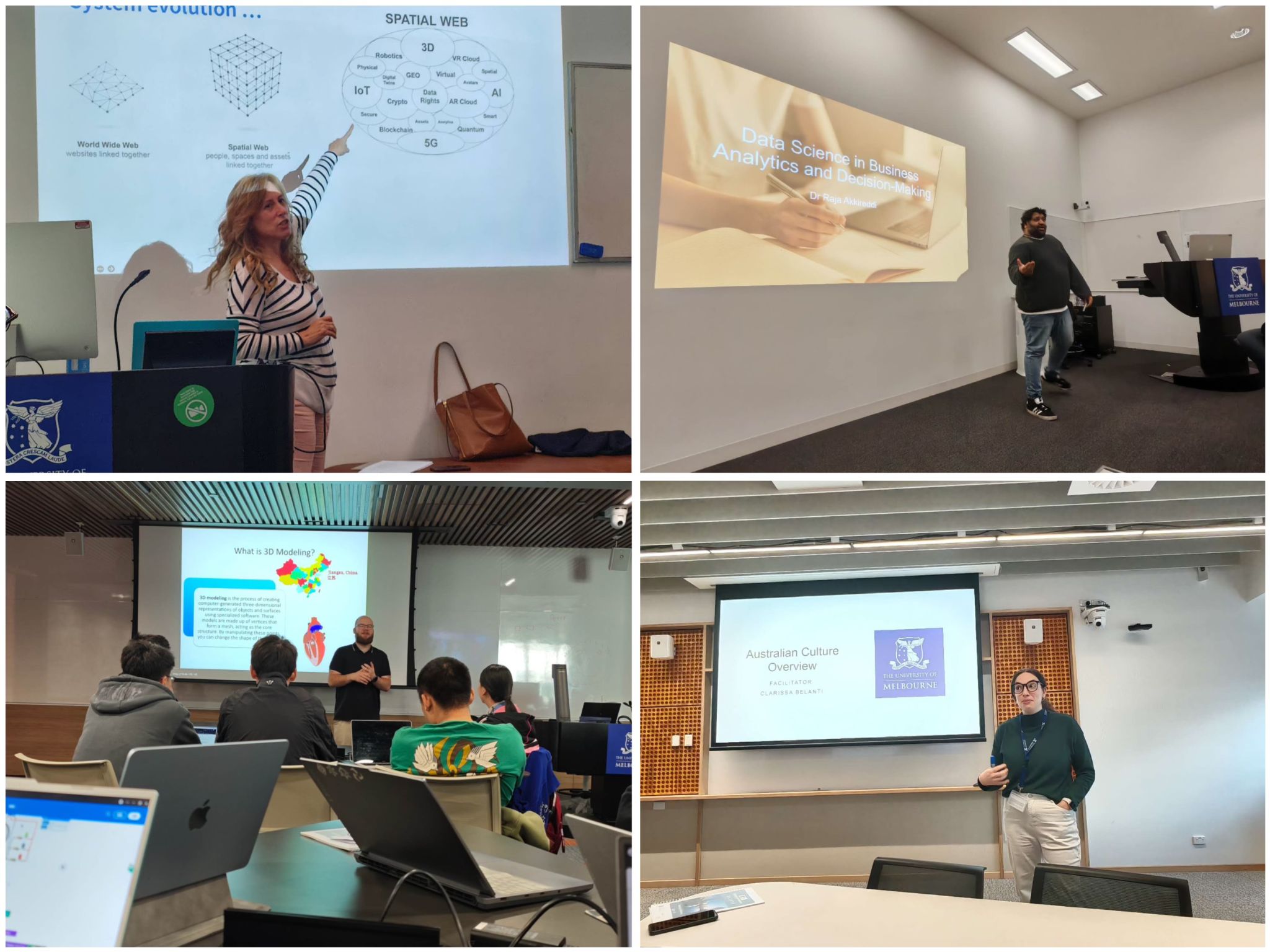 访学期间,同学们先后参加了墨尔本大学、莫纳什大学的多场讲座。在墨尔本大学,Sophie老师围绕领导力AI对时代发展的作用进行了详细阐述,并指导同学们如何解决将AI引入工程后产生的问题。Raja老师以“商业分析和决策力中的数据科学”为主题,深入浅出的讲解了人工智能的发展及商业应用,并与同学们就技术对社会的影响进行了交流。Clarissa Belanti 老师带大家从不同视角了解澳大利亚文化。Tesfaye Molla老师介绍了材料和3D打印相关知识,Peter和Shef老师将理论与实践相结合,指导学生3D打印出自己的设计作品。在莫纳什大学,Jeffrey Walker 教授及其课题组成员为同学们讲授了多种遥感技术在分析土壤含水量方面的原理与应用知识。Ford Brakhasi老师介绍了遥感技术在环境监测与灾害管理方面的应用。