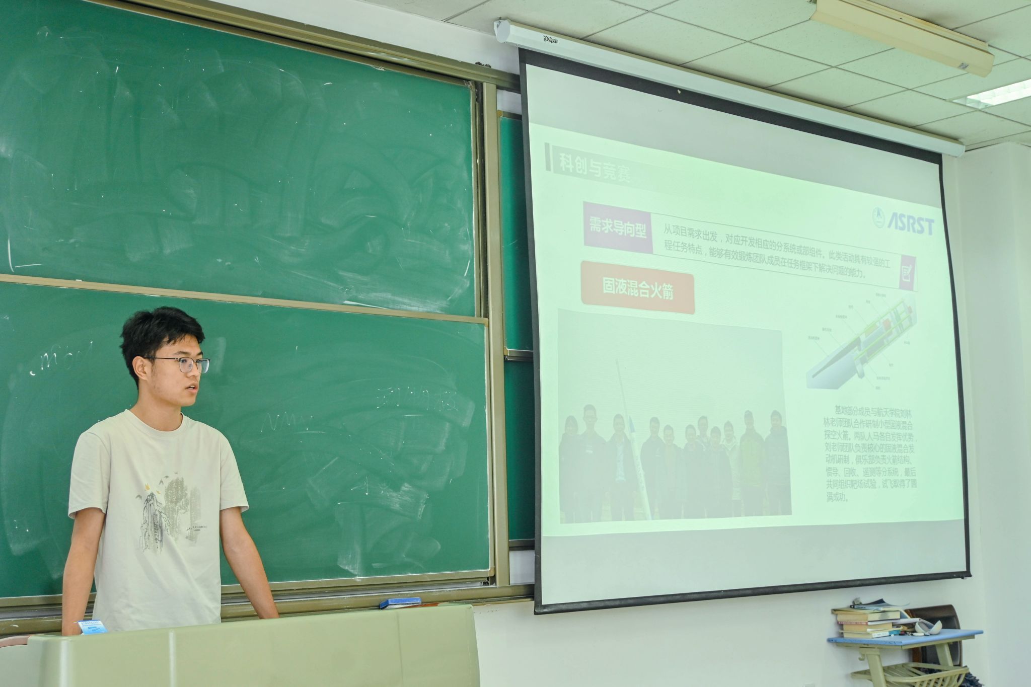 接着,大学生未来航天器设计与制作创新实践基地陆煜祺同学分享了基地在科创项目与竞赛方面的探索历程及相关成果,详细介绍了基地学生在固液混合火箭、模型水火箭运载航天器、多级模型火箭运载与返回等模块的创新设计思路与实际应用情况,列举了基地在中国国际飞行器设计挑战赛暨科研类全国航空航天模型锦标赛、中国大学生飞行器设计创新大赛中取得的成绩。