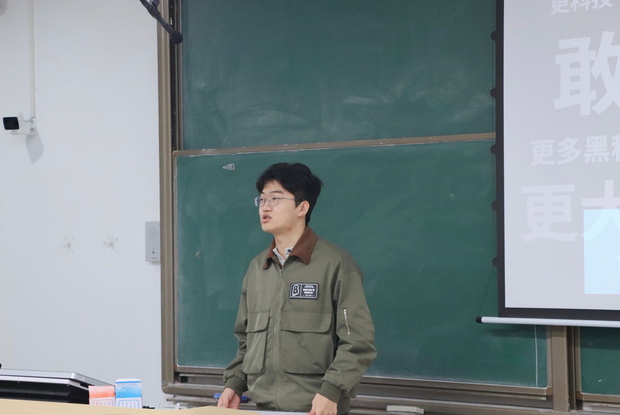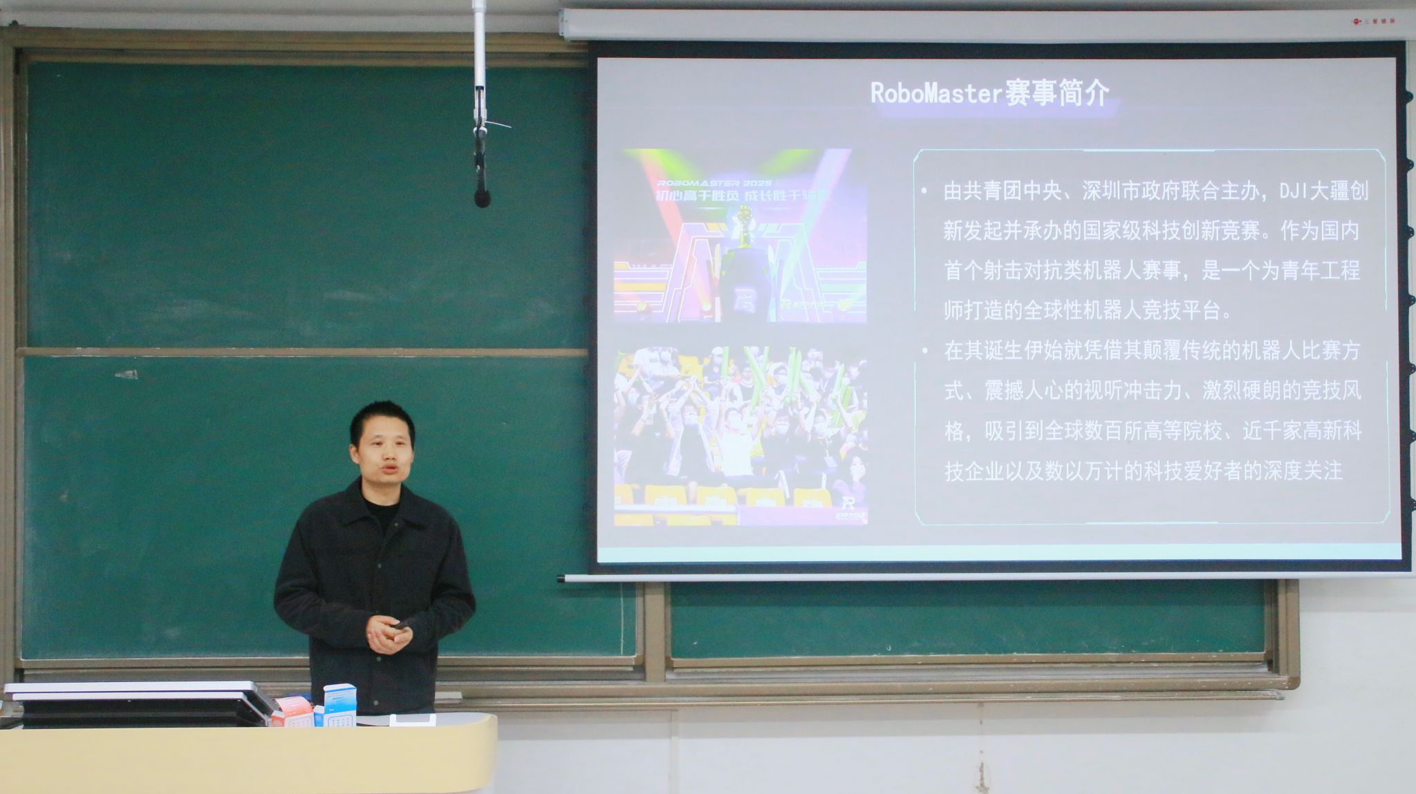 蔡力首先介绍了吕冰老师在教学及创新创业方面的成果。随后,吕冰老师围绕基地硬件条件、师资配置与创新成果,简要介绍了基地的建设情况,着重讲解了RoboMaster机甲大师赛事的背景与规则。他结合bat365在线官网平台WMJ战队的实际赛况,生动讲述了队员们在备赛期间日夜奋战、克服困难、持续优化机器人性能的拼搏过程。从适应性训练到小组赛、淘汰赛,队员们始终全心投入,在每一阶段都与机器人紧密配合,在实战中锤炼能力,在与队友的协作中共同成长。