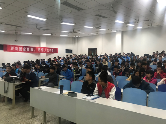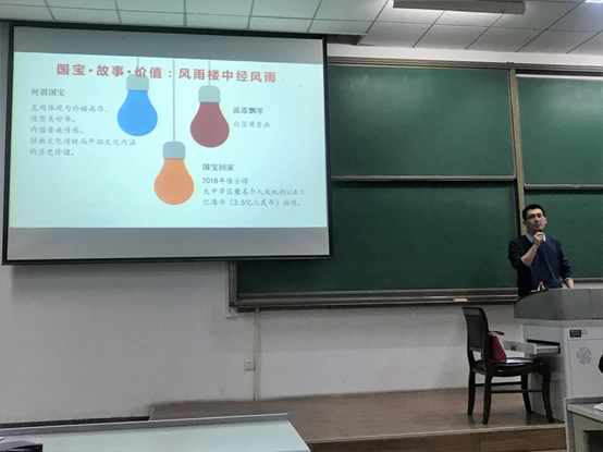 他首先用被拍出天价的苏轼画作《枯木怪石图》激起了同学们对于国宝价值的思考,国宝的价值绝不仅仅是表面上的价格高昂、造型美妙,他其中蕴含着的普遍情感、继承文化传统而开拓文化内涵的历史价值更加弥足珍贵。国宝中凝聚了一系列关联着的故事,故事中汇聚了世间多样的情感,情感中内蕴着人性的光辉和卑劣。
