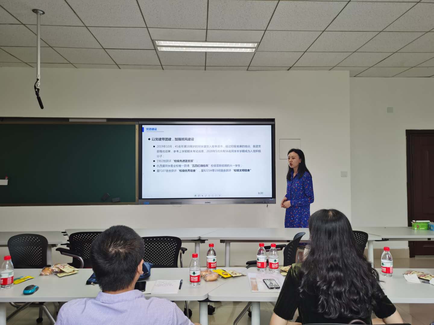2019级本科生辅导员黄芮老师从党建引领,学风建设,学科竞赛,实践活动四个方面介绍了年级学生状态,深入分析了心理困难、学业困难、经济困难、身体困难的学生情况及具体帮扶措施和成效。重点以期末成绩为主线,对年级本学年成绩和学风状况进行了详细分析,从舍风打造等方面查问题,找对策。最后,黄芮老师围绕强化党建引领,推进荣誉激励计划,引导学生做好学业规划三个方面汇报了下一步重点工作计划。