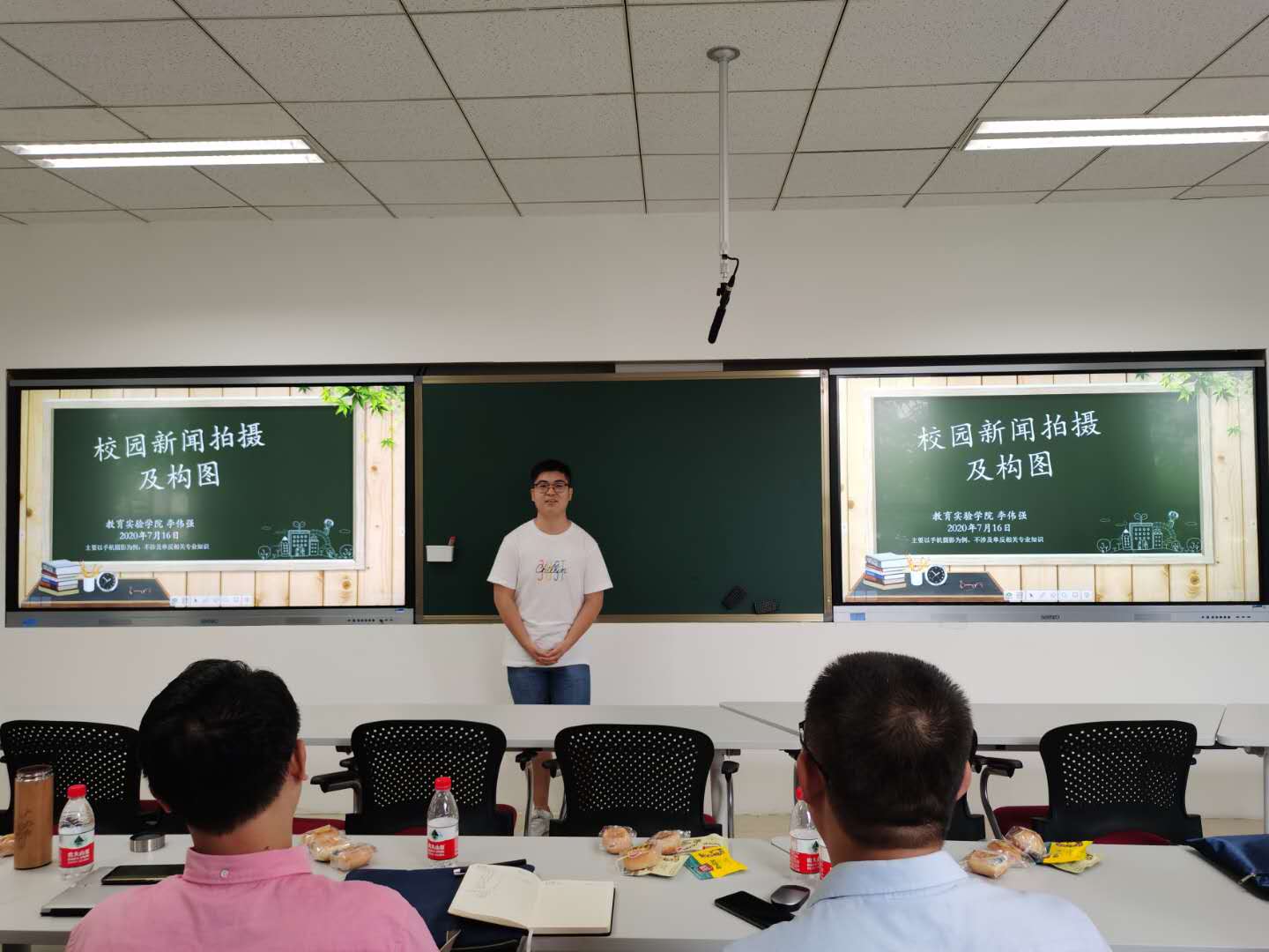 我院2017级学生李伟强,以“校园新闻拍摄及构图”为主题,针对不同场地、不同活动的拍摄角度选择和技巧方法,以及拍照时如何讲究构图技巧等方面与大家进行讨论交流。