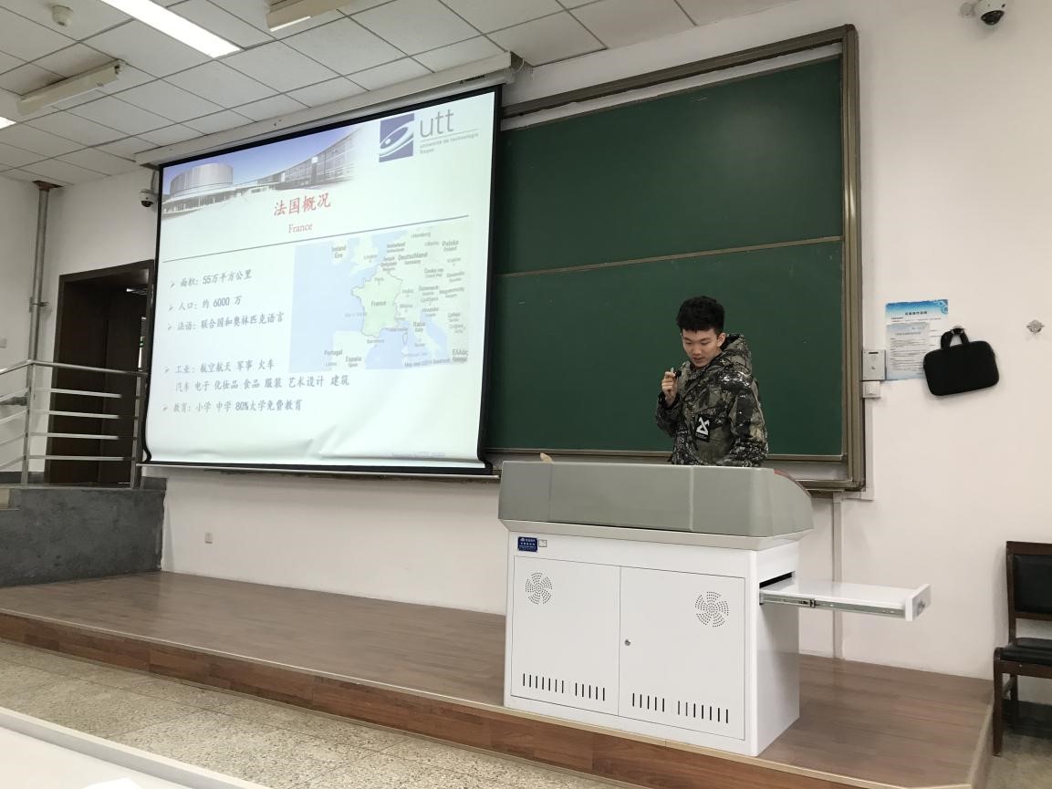 紧接着,bat365在线官网平台2015级本科生赵望博同学就法国特鲁瓦技术大学项目与大家进行了分享,他介绍了该项目的具体内容,并且讲述了自己在法国两年的留学经历。其中他分享了自己在法语学习方面的经验,还讲述了在那边的专业课学习情况及日常的娱乐生活,他表达这两年的国外学习经历对自己的思维、视野及未来规划方面都有很大的收获,因此鼓励大家应争取机会走出去看看这个世界,由此可以更好的提高自身的综合素质。