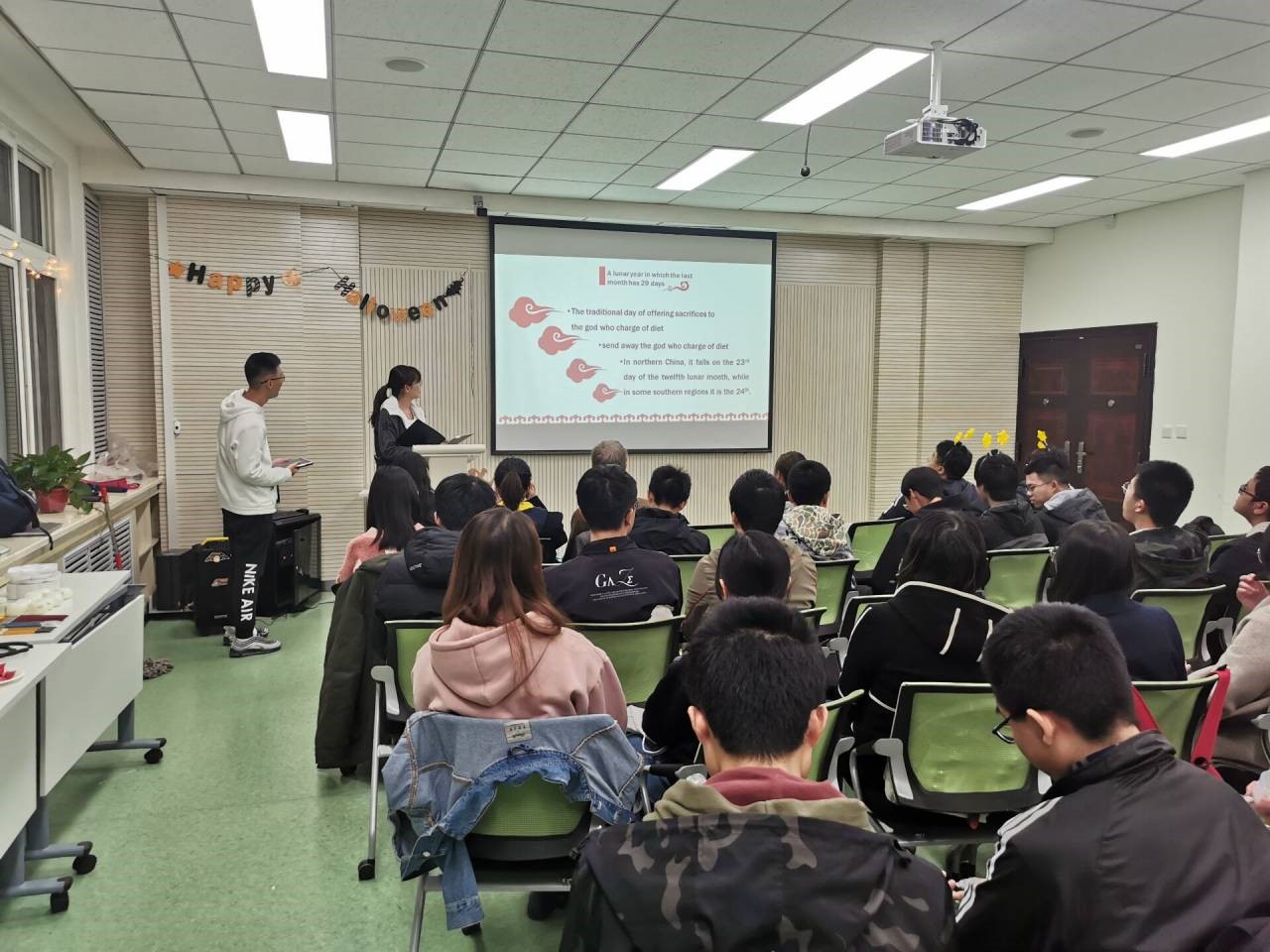 随后,Tim Kingham老师讲授了自己的教学经历,并向同学们介绍了西方传统节日的特点及习俗,以“万圣节和圣诞节”为例,分享了节日的历史文化与人文风情。其次,为了培养同学们以正确的态度对待西方文化,2019级本科生施婧如同学以“春节”为主题,分享了中国传统节日的来源与习俗,对比了中西传统文化的不同,让同学们深入了解中国传统节日的方方面面。分享过程中,同学们兴趣盎然,积极展开讨论交流,感受不同文化间碰撞的魅力。