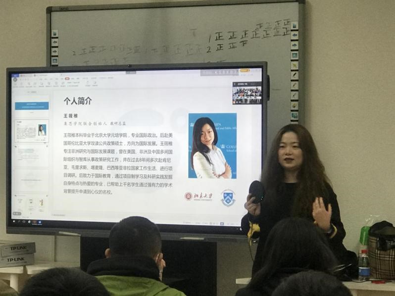 王篠稚首先为大家介绍了海外科研项目的基本情况及海外科研项目的成功案例,强调了参加海外科研项目的重要意义。她表示世界名校录取的条件除了优秀的成绩以外,丰富的学术阅历,尤其是与海外名校导师合作的科研经历将会是通向海外名校的重要“敲门砖”。通过生动的案例,王篠稚为大家展示了海外科研项目的实施过程,讲授了如何选择合适的科研项目,并为同学们提供了开拓国际科研经历的新渠道和相关指导。之后,她介绍了集思海外科研项目奖学金资助的申请条件和流程,鼓励大家设立目标,及早规划。