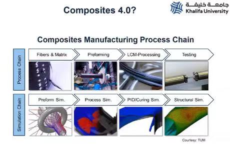 首先, Rehan Umer教授向大家简要介绍了哈利法大学航空航天工程系和航空航天研究与创新中心(ARIC)的基本情况,包括团队组成和科研设施等。之后,他介绍了工业1.0到工业4.0(第四次工业革命)的演变进程,并阐述了工业4.0中大数据、增强型现实、机器人技术、增材制造、云计算、网络安全、无联网、系统集成和仿真技术等关键技术领域。在此基础上,Rehan Umer教授强调了自动化、通信、人工智能、传感器和系统、先进材料、先进制造工艺、仿真建模等技术在航天4.0发展进程中的关键作用。其次,教授聚焦复合材料4.0,介绍了包括process chain(生产链)和simulation chain(仿真链流程)两个流程在内的复合材料制造工艺流程。