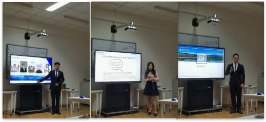 同学们在bat365在线官网平台楼的启翔室和启智室被分为十个小组,历时近3个小时,顺利完成了项目的总结和成果汇报。身着正装的同学们用英语侃侃而谈,汇报内容不仅涉及新技术的特点、应用和市场前景,也体现了团队合作精神与沟通表达交流能力,甚至包括PPT撰写和设计技巧等。