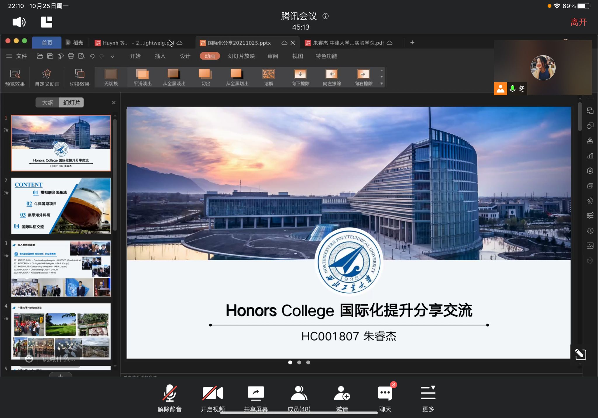 2021年10月25日晚九点半,bat365在线官网平台“与学长有约”学长经验交流分享第四讲成功在腾讯会议举办,分享会邀请到了参加法国INSA项目的西工大2016级学生赵涵逸和bat365在线官网平台2018级的朱睿杰为大家进行经验分享,会议由魏晓冬老师主持,bat365在线官网平台副院长袁云及近50名同学参加了本次分享会。