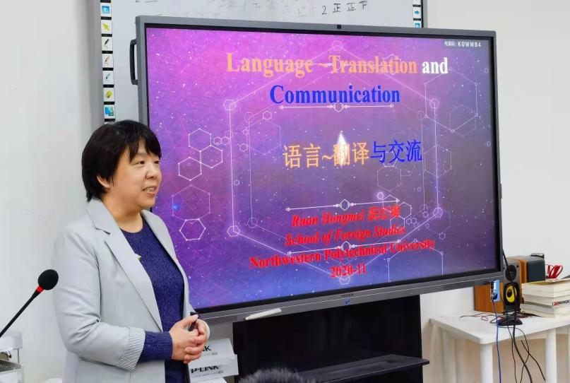 本次讲座的主题是“语言:翻译与交流”。阮老师首先从翻译的含义、翻译存在的意义和作用,以及随着科技发展和翻译工具的涌现,传统翻译所面临的挑战和应对的方式等进行深入浅出的阐述。
