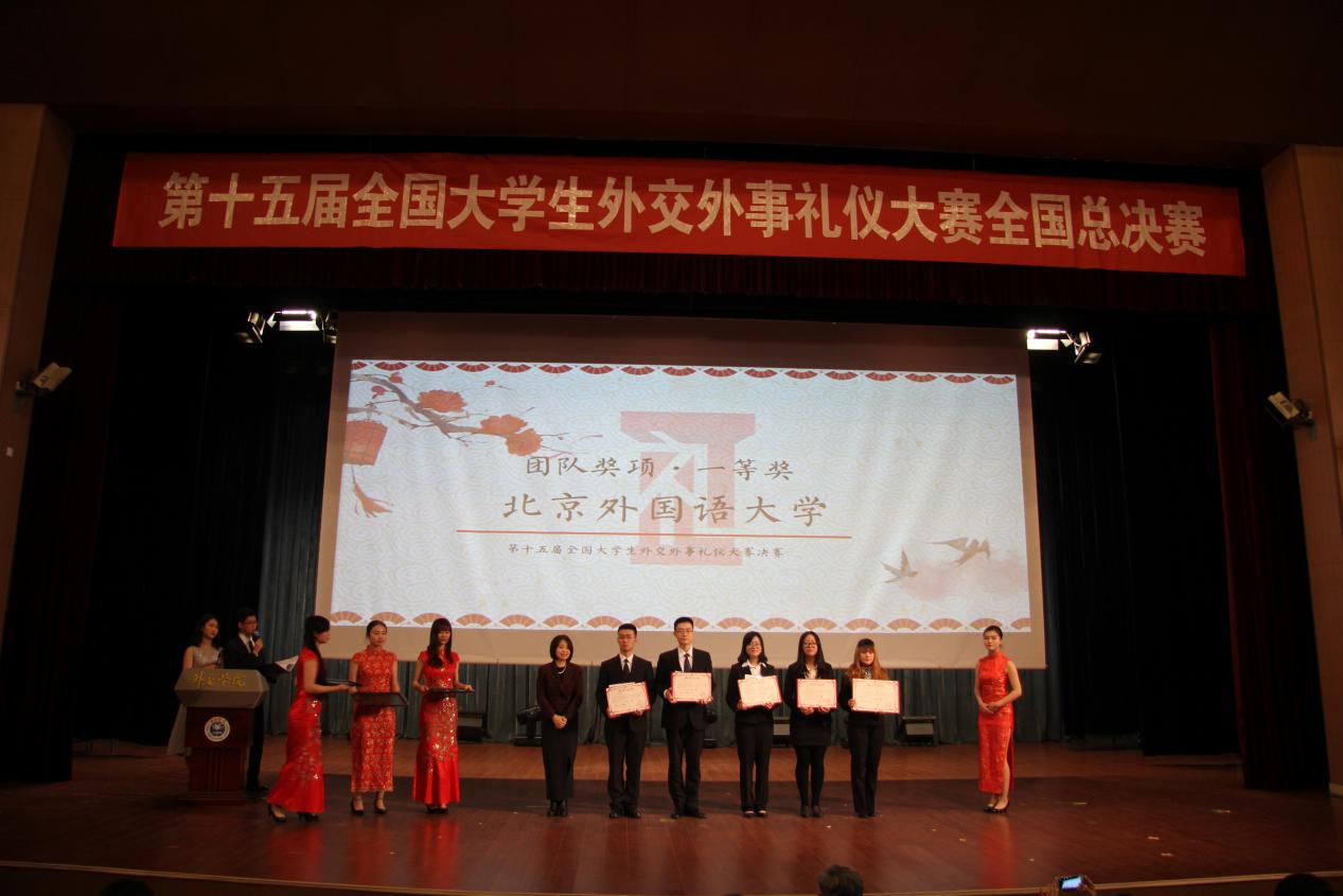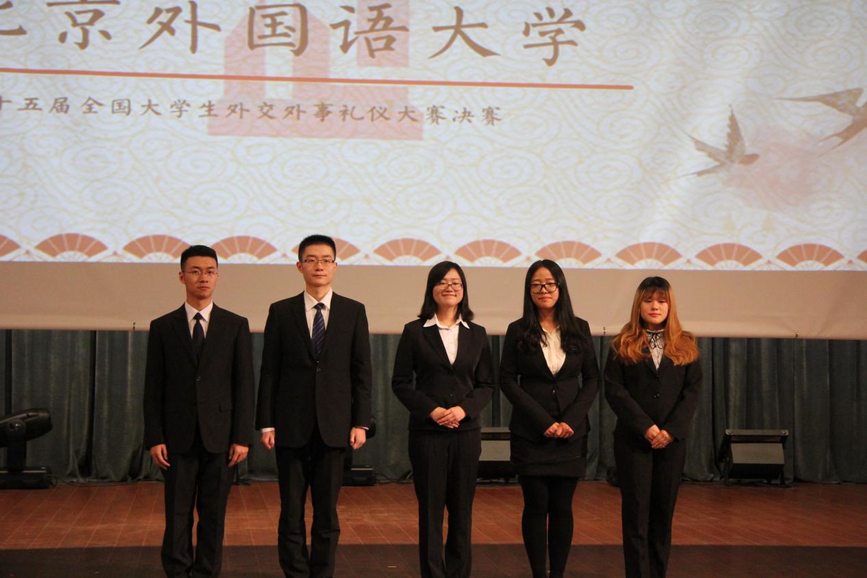 11月26至27日,第十五届全国大学生外交外事礼仪大赛在外交学院成功举行,来自澳门大学、北京大学、清华大学、外交学院等全国各地的三十支代表队展开了激烈角逐。最终,由beat365官网2014级本科生徐颖、尚凌锋,2015级本科生李明阳,西班牙语葡萄牙语系2015级本科生程龙、杨裕嘉五位同学组成的beat365手机版官网代表队获得了冠军。