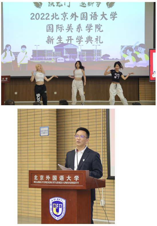 接下来,22级外交学(中外合作办学)专业的彭李思瀚同学作为新生代表发言。彭李思瀚同学首先表达了对提供帮助的老师、学长学姐们的感谢,并表达了对于来到北外的欣喜、对于大学生活的憧憬,也立志以诸多优秀校友为榜样,号召同学们对自己未来的学习与发展提出更高期待与要求。