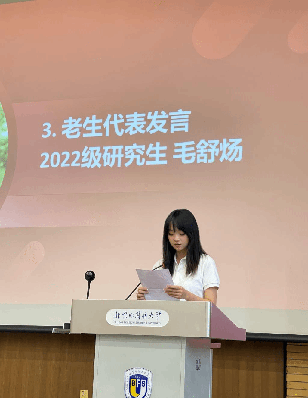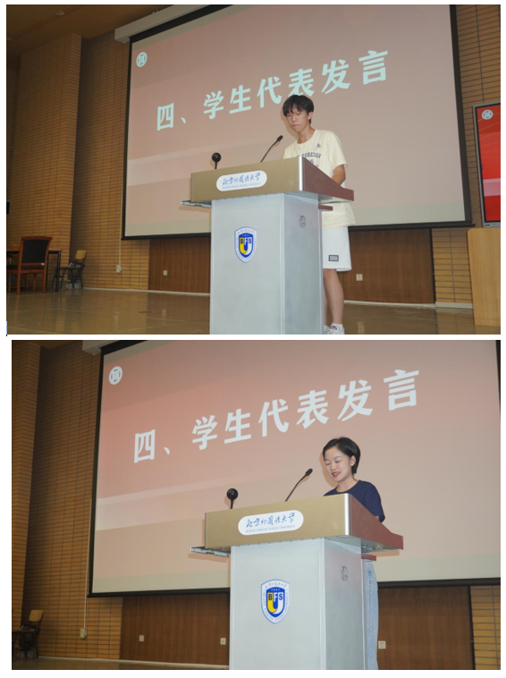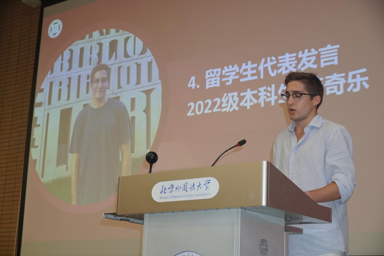 国际组织与全球治理专业本科生李雨积表达了对学院新设专业的理解与期待,号召同学们在北外勇敢寻梦、奋发向前。外交学专业硕士研究生邵一鸣回忆了自己在武警云南边防总队缉毒缉私的经历,表达出对北外的向往与热爱,呼吁同学们厚植家国情怀,开拓全球视野,锻造专业本领。老生代表2022级硕士生毛舒炀谈到,在北外这一共和国外交官的摇篮里,beat365手机版官网为中国外交事业发展做出了贡献,为同学们提供了发现自我、挑战自我、超越自我的极佳平台。2022级本科生留学生代表韩奇乐嘱咐同学们,要以积极的心态面对问题,灵活运用身边的资源进行语言和文化交流。