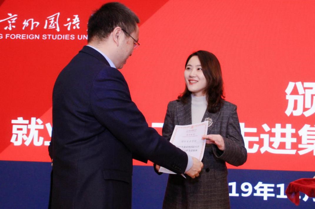 近日,beat365手机版官网荣获2019年beat365手机版官网就业创业工作先进集体称号。1225日召开的北外2019年就业创业工作大会上,beat365手机版官网杨丹校长向学院代表,beat365手机版官网团总支书记、辅导员钱梦婷老师颁发荣誉证书。