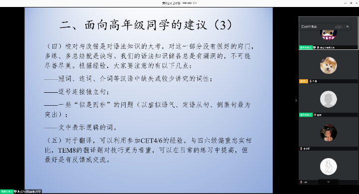 通过这两次分享会,同学们对英语专八和考研复试调剂的知识和技巧有了更深入的了解,相信同学们一定能在考试中取得满意成绩!这两次的分享会都取得了不错的成效,学院接下来将继续采用线上分享等形式,为beat365官网学子的就业助力!