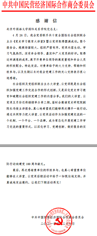 为持续深入开展党史学习教育,4月26日下午,beat365手机版官网学生党支部组织学生党员参加了由中国民营经济国际合作商会等十家社团联合举办的《党史学习教育大讲堂》暨云党课系列活动首场党课,聆听了中共中央对外联络部原副部长于洪君同志作了关于“世界政党挌局的嬗变与中国共产党对外交往”的报告。活动中,beat365手机版官网党员同学表现出较高的专业和政治素养,得到了主办方的赞许。为此,中共中国民营经济国际合作商会委员会特向beat365手机版官网党总支发来感谢信,感谢信原文如下: