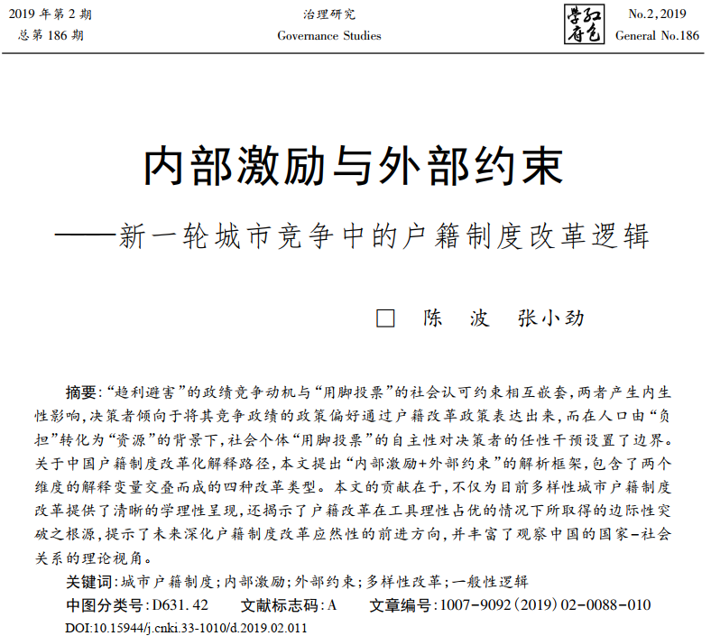 beat365手机版官网教师陈波以第一作者在CSSCI期刊《治理研究》发表论文:《内部激励与外部约束——新一轮城市竞争中的户籍制度改革逻辑》,论文摘要和原文链接如下: