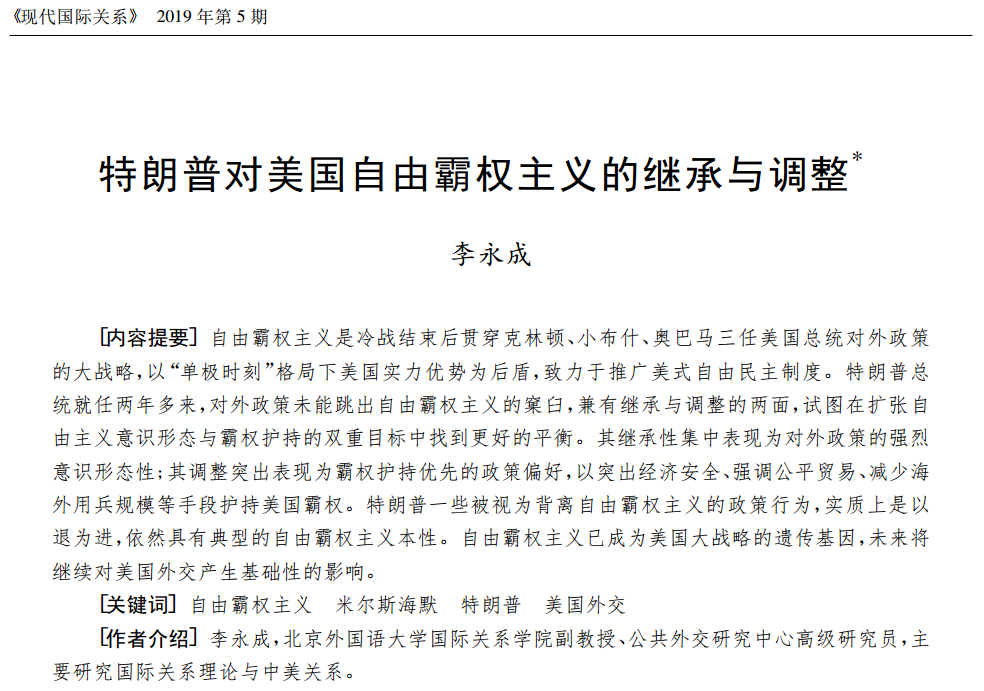 beat365手机版官网李永成副教授在CSSCI期刊《现代国际关系》2019年第5期发表论文《特朗普对美国自由霸权主义的继承与调整》,论文摘要和原文链接如下: