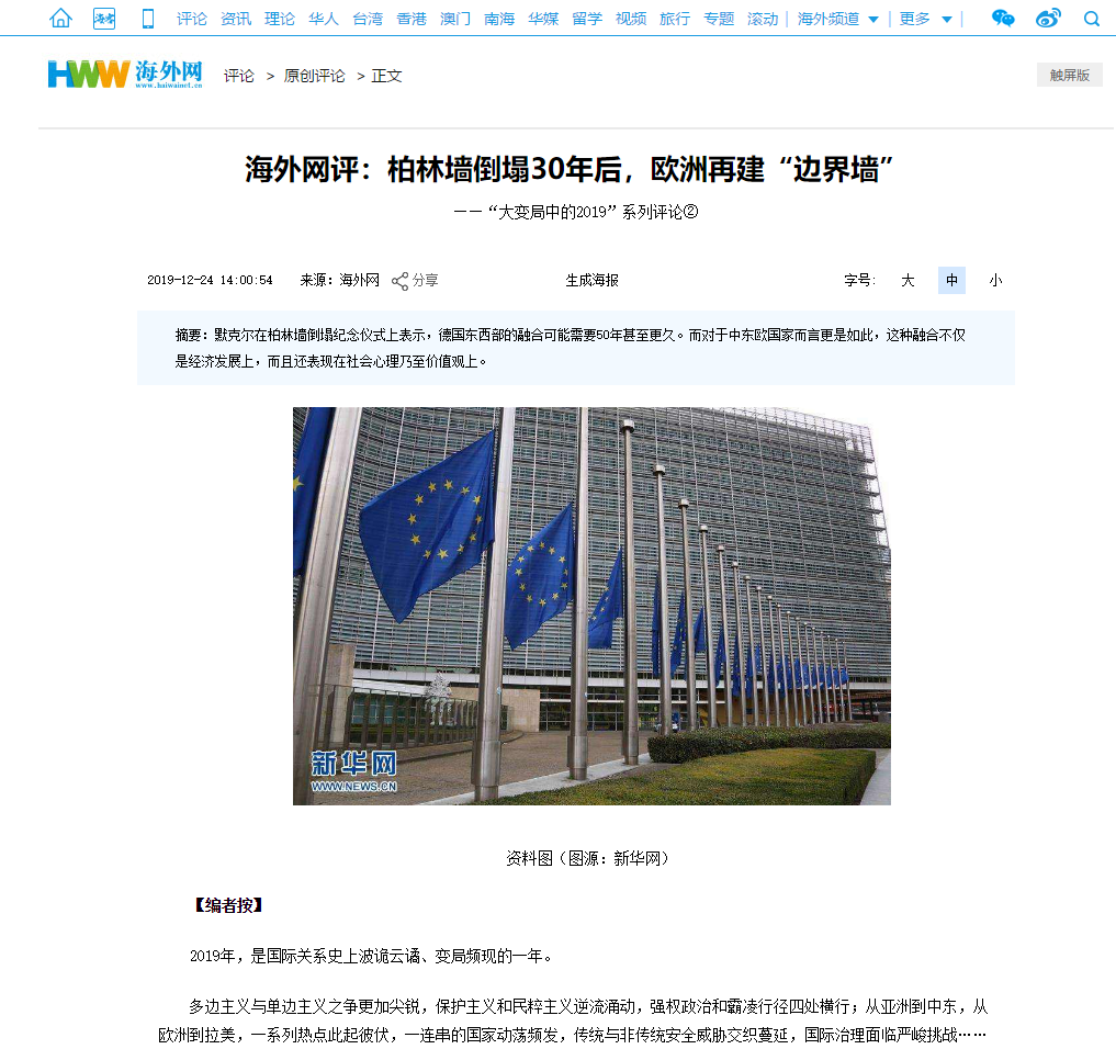 beat365手机版官网王明进副院长作为海外网特约评论员发表文章,题目是《柏林墙倒塌30年后,欧洲再建“边界墙”》。该文是海外网推出的年终系列国际评论,“回望‘大变局中的2019’”的第2篇。海外网致力于打造中国在海内外具有重要影响力的新媒体国际传播平台,第一时间向读者提供中国热点、国际时政,特别是涉华国际新闻事件的权威解读。以下是文章题头截图、摘要和文章原文地址。