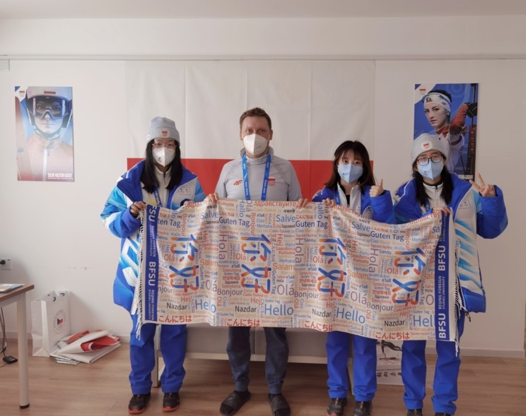 奔走于北京和张家口的各处辛苦但也无疑是万分有趣的。我锻炼了自我,还结识了许多来自世界各地的新朋友,包括互帮互助的志愿者、贴心负责的北外带队老师和严谨专业的工作人员。当然,最令我感动的还是友好和善的外国朋友们。在一个月的朝夕相处中,我与我负责的波兰代表团建立了深厚的友谊,他们总是感谢、夸奖我们,说我们语言好、态度好,我也因此不停地说不用谢,还学了波兰语“Cała przyjemność po mojej stronie(不用谢、是我的荣幸)”。当我说出这句波兰语时,他们直呼惊喜与激动——那一刻,我感受到北外人的外语力量,也感受到志愿工作的意义。此外,我也遇到许多其他国家或地区的人,大家无分国界地在一起合影、交谈,四处都洋溢着天下一家、美美与共的氛围,令我感到无比温暖。回顾参与冬奥会的一个多月,我遇到了更好的自我、结识了许许多多的新朋友,还收获了亲如家人的爱——“更高、更快、更强、更团结”,这就是北京的奥林匹克精神吧。