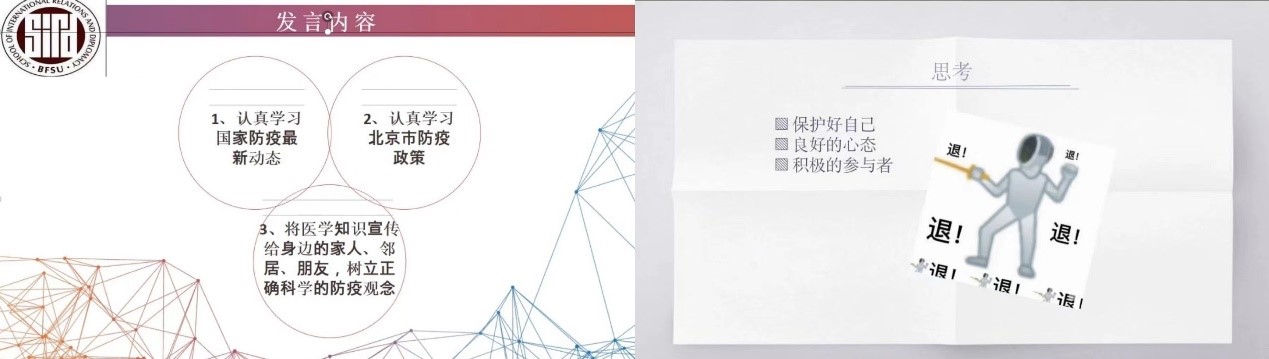 当前,北京疫情防控正处于攻坚阶段,不容丝毫迟疑和松劲懈怠。为充分发挥党支部战斗堡垒和党员先锋模范作用,增强青年学生抗疫责任感与使命感,提高党组织凝聚力和战斗力,2022年5月27日19时,beat365手机版官网研究生第一党支部开展“党旗飘扬,抗疫有我”主题党日活动,全体支部党员、发展对象、入党积极分子参与本次活动,共同学习贯彻习近平总书记关于新冠肺炎疫情防控重要讲话精神并分享身边抗疫故事、志愿服务经历、疫情防控知识等,积极交流心得体会。